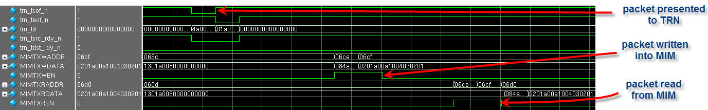 The figure below shows the flow of a packet being transmitted from the TRN interface and going through the transmit MIM interface.