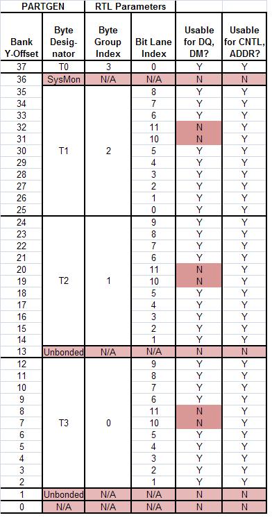 The above PARTGEN output shows that pins AA20 and AB20 belong to byte lane "T0" on Bank 12 (note that pin AB20 is also a possible VREF site), and that pins AB24, and AC25 belong to byte lane "T1" on Bank 12.