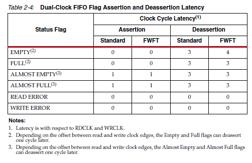 There can be multiple cycles of latency on the assertion/de-assertion of the FIFO flags, and there is one additional cycle of uncertainty on the falling edges of the FIFO flags.